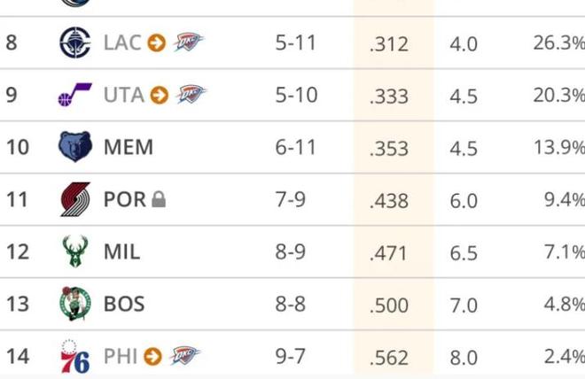 这估计也是NBA历史中为数不多的画面,当然雷霆高兴,快船等球队就没那么开心了,手里的选秀权不属于自己,摆烂也就毫无意义,所以我们看到快船哈登透支也要赢球。